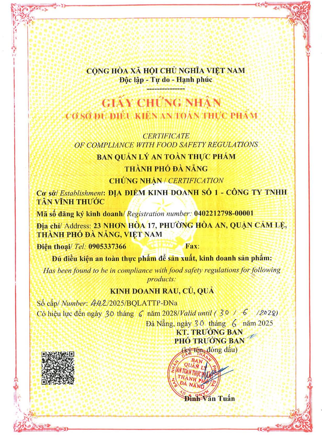 Công ty TNHH Tân Vĩnh Thước cam kết mang đến nguồn rau củ quả an toàn, giàu dinh dưỡng và tươi ngon mỗi ngày, đồng hành cùng khách hàng và đối tác trong việc xây dựng bữa ăn lành mạnh, trọn vẹn và bền vững.